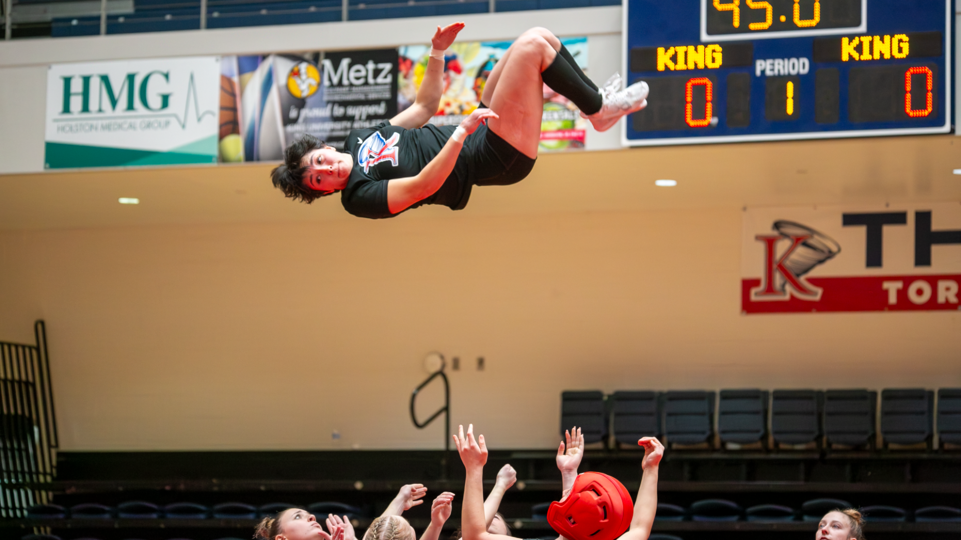 BRISTOL, Tenn. – The King University acrobatics & tumbling team had an impressive home debut on Friday night. The 11th-ranked Tornado came from behind, using a big tumbling event to top 15th-ranked West Liberty University 259.38-257.330.