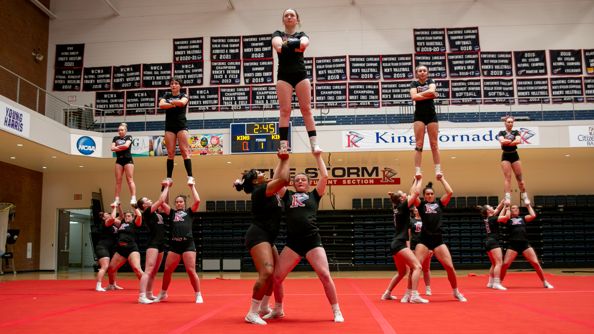 In the acro event, King posted a program best in heat two and matched a program best in heat three. The Tornado group of Stephanie Rhea, Kara Christian, Coleman and Banks, Emily Powers, Angela Powers and Davis scored 9.80 in heat two, and Banks, Emily Powers, Angela Powers, Coleman, Courtney Poister Landers, Steffey and Davis posted a heat three score of 9.35. King posted a program best total of 28.60 in the acro event while Baylor scored 29.20.